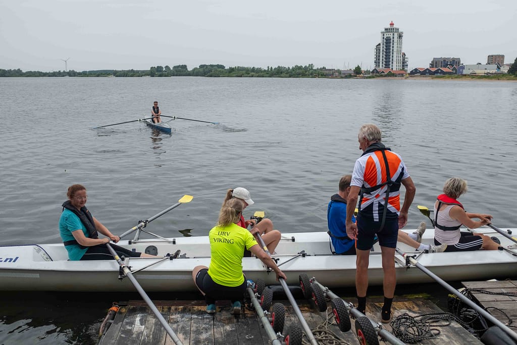 Vandaag hadden we een groep roeiers van de Utrechtse Roeivereniging Viking te gast. Ze waren vooral geïnteresseerd in onze coastal boten, want Viking roeit met conventionele ‘gladde’ boten. Coastal boten zijn breder en stabieler en geschikt voor vrijwel alle wateren, dus ook de kanalen rondom Utrecht waar het vaarwater flink kan klotsen vanwege de beroepsvaart.